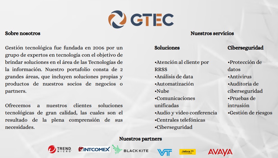 Gestión tecnológica fue fundada en 2006 por un grupo de expertos en tecnología con el objetivo de brindar soluciones en el área de las Tecnologías de la información. Nuestro portafolio consta de 2 grandes áreas, que incluyen soluciones propias y productos de nuestros socios de negocios o partners.