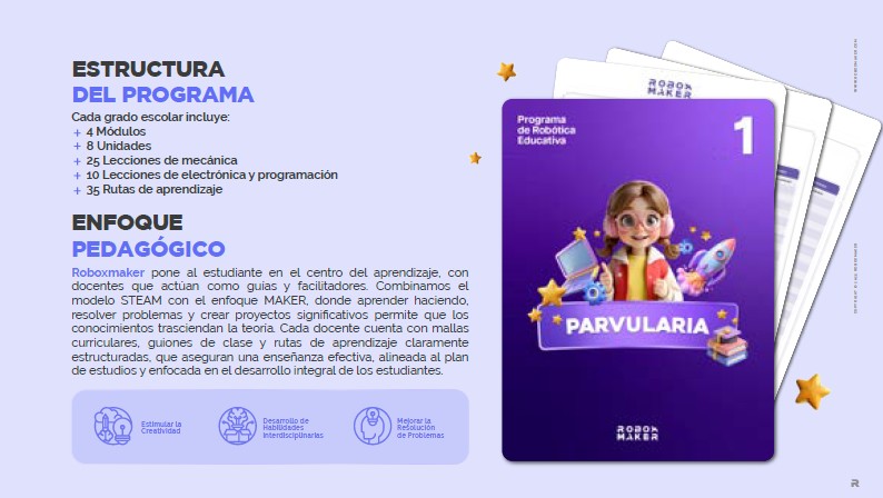 Roboxmaker desarrolla y distribuye una solución educativa integral compuesta por una plataforma digital interactiva, contenidos pedagógicos STEAM, simulador 3D, y rutas de aprendizaje en robótica, electrónica y programación para niveles desde parvularia hasta bachillerato. Además, proporciona formación docente, acompañamiento técnico-pedagógico y materiales digitales para instituciones educativas públicas y privadas.